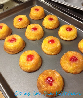 Set the oven to 350 degrees. Split the butter among the muffin tins, and pop into the preheating oven for one to two minutes. Remove from the oven, and sprinkle the brown sugar into the melted butter. Slice the cherries in half, and place in the center of each muffin tin, with the flat side facing up. Drain the juice from the pineapple into a bowl or cup (be sure to keep the juice!), and spoon the pineapple into the bottom of the muffin cups, around each cherry.